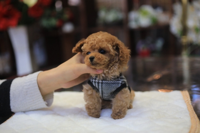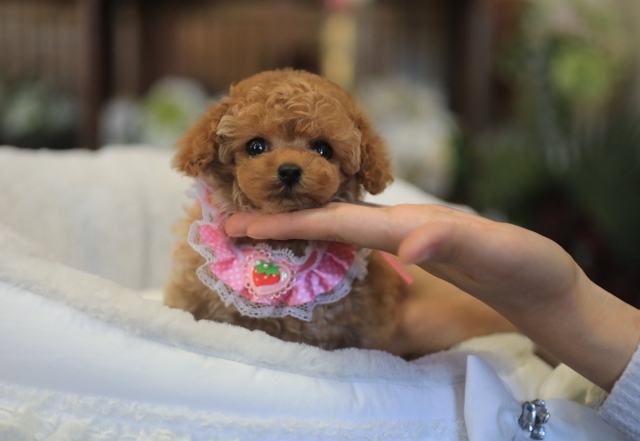 | コメント | ちびっちびサイズで お目目クリンクリン 手足・お鼻の短い女の子の飼い主さまを募集します(^^) 性格が明るく、内向的(シャイ)ではありません。 小さい子なので大切に可愛がって下さる方でお願いします。 お渡しは60日齢以降です。 父:レッド ティーカップサイズ(1.4kg) 母:アプリコット ティーカップサイズ(1.7kg) 欠点ありません。(健診検便異常無し) |