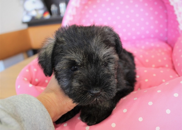 見学の申し込みからの対応も凄く良くて、当日の応対も非常に親切に的確に対応して貰えました。その場で直ぐにこの真摯な対応ができる人が繁殖させたワンコなら心配ないと思ったので内金を払い2週間後の昨日ワンコを引き取ることに致しました。ワンコを連れて新幹線に乗るのは初めてだったのでどんなもキャリーケースを用意して良いのか判らなかったので、準備をお願いしておいたところちゃんとした物を用意しておいてくれました。書類の説明や今後の飼い方その他に付いても質問にも丁寧に受け答えをしてくれて有難かったです。引渡し前にちゃんとシャンプーもされていたらしく良い匂いでした。この子でシュナウザーは4頭目ですが、今までにはこれほど手厚い対応をして貰ったのは初めてです。有り難うございました。(東京都 男性)