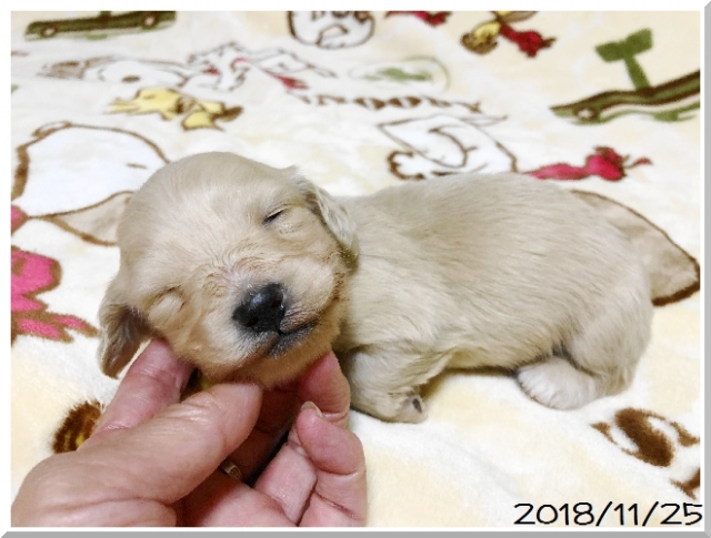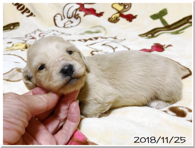 | コメント | パパはJKCチャンピオン直子の茶美太【ちゃみた】君。 ママはJCKチャンピオンのウィンクちゃん。 優秀な両親から生まれたとってもきれいな毛色の女の子ちゃんです。 毛色はイエロー(ピュアクリーム)です。 ほぼ真っ白に近いくらいの明るいクリーム色です。 色素もばっちりで毛量が多く、重心の低いイギリスタイプのカニンヘンロングダックスちゃんです。 PRA(遺伝疾患網膜委縮症)のDNA検査をしておりますので、子犬ちゃんがPRAを発症する心配はありませんので、ご安心下さい。 とてもかわいらしくて穏やかな子です。 生後30日で3種混合ワクチン、生後50日で6種混合ワクチンと健康診断を実施します。 お迎えいただけるのは年末年始頃です。 見学やご予約のお問い合わせをお待ちしております。 遠方の方にはお届にあがることも可能ですので、ご相談ください。 |