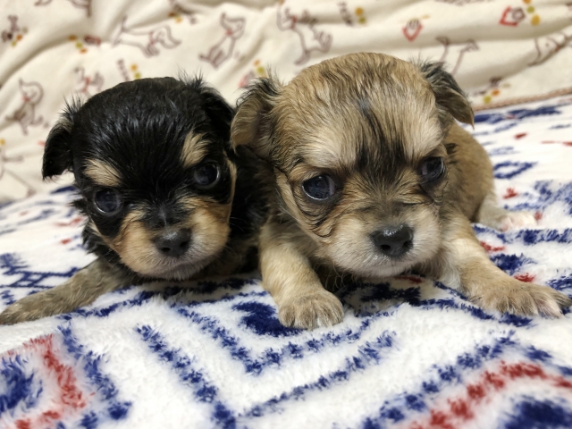 | コメント | パパはアメリカチャンピオン、カナダチャンピオン、JKCチャンピオン直子の輝斗【ライト】君(ブラック&クリーム)。 ママはJCKチャンピオン直娘のまつりちゃん(フォーン) とってもかわいい両親から生まれた2頭兄妹です。 ママは体重2キロ弱のとても小さな子なので、帝王切開で出産しました。 子犬ちゃん達はコンパクトサイズですが、離乳食も始まりとても良く食べて元気でムチムチに育っています。 両親共に性格の良い人懐こい子たちですので、穏やかで明るい性格に育ってくれることと思います。 生後30日で3種混合ワクチン(当方にて負担)、生後50日以降に6種混合ワクチンと健康診断を実施の後、年末年始ころより、お引き渡しが可能となります。 見学もしていただけますので、ぜひお問い合わせをお待ちしております。 |
