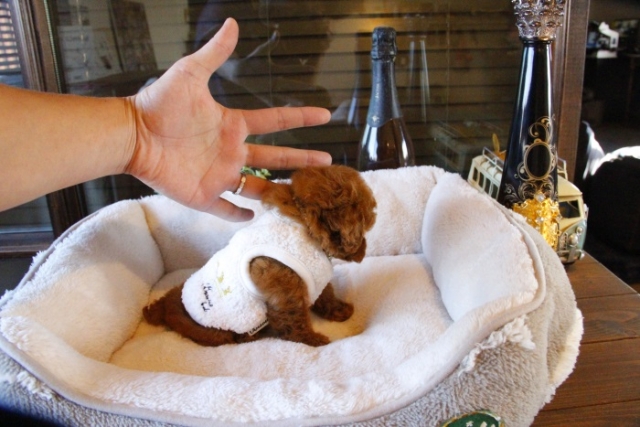 本日、我が家に小さな可愛い女の子のトイプードルがやって来ました。 遠距離という事もあり、暑い時期、飛行機の事なども心配していましだが、家に着いた途端、元気に走り、食欲も旺盛で、今まで大切に育てられてきたのだなぁ、ということがよくわかりました。 連休中にも関わらず、戸田様には、伊丹空港まで連れて来て頂き、こちらの質問にも的確に答えて下さいました。 大変信頼できるブリーダーです。 遠距離で悩まれている方も、安心して新しい家族を迎えられますよ。(兵庫県 男性)