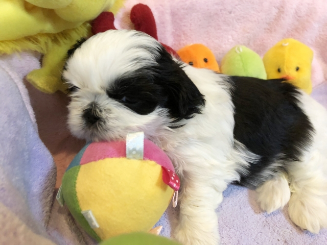 | コメント | 当犬舎出身の男前な父犬ボムくん(ゴールド&ホワイト)と 小柄で器用でキュートな母犬パールさん(ブラック&ホワイト)の 四女ちゃんです。 幼名「ヘレナ」と名付けて 「レナちゃん♪」と呼んでいます。 キレイなブラック&ホワイトの被毛の女の子です♡ 優しいお顔をしていて、とても愛らしいです。 黒目がちで目力があって、 目が合うと照れちゃうくらいの可愛さです。 オモチャも大好きで一人遊びも出来、 兄妹とジャレ合うのも好きで社交性もあり 優しくて努力家で シーズーらしい活発さを持っています♡ ママのオッパイが大好きで たっぷり飲んでコロコロに成長しております♡ 離乳食、始めています。 トイレトレーニングも順調です。 1ヵ月健診でお墨付きをいただいております。 ~当犬舎より~ 子犬が今食べているものと同じフードを1袋プレゼントさせていただきます。 健康診断(健康診断書有り)、駆虫薬投与済の状態でお引渡しさせていただきます。 60日間の健康保険をプレゼントさせていただきます。 一生大切に可愛がっていただける飼い主様を お待ちしております。 |