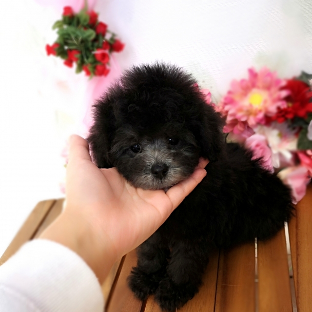 ブラックの男の子のトイプードルを探していました。こちらで見つけ問い合わせをしたところ、永谷ブリーダーからすぐに連絡があり、こちらのいろいろな質問にも丁寧にお答えいただいたので、本当に安心してピースを迎える事ができました。空港にてケースの中の小さいピースに感動と感謝で家族全員泣いてしまいました(笑)この子に会えて心から良かったと思える瞬間でした。2人の子ども達とも仲良く遊びまわり、よく食べよく寝る元気な末っ子です(笑)みんなを笑顔にしてくれるピースが楽しく幸せに暮らせるように、大切に成長を見守っていきます。本当にありがとうございました。(大阪府 女性)