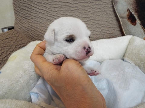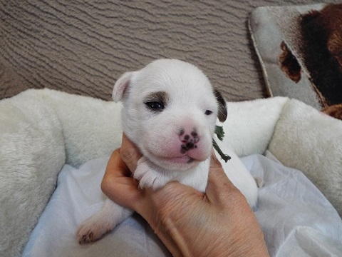 | コメント | 母親・・・白茶・スム-ス・小ぶり 父親・・・白茶・ブロ-クン とても可愛いユニ-クなジャック達が誕生しました! 目が開いたばかりで、まだまだあつぶらな瞳ですが、 成長と共に大きく可愛くなってきます。 JRTは、全体の51%白毛なら、どんな風に柄が入ってもミスカラ-ではありません。 かえって個性的で可愛いですよ~ 生後45日で初回ワクチン接種、健康診断、検便など獣医で済ませてからのお渡しになります。 見学大歓迎! 今なら血統書名に呼び名をお付け出来ます。 お渡し後の躾などアフタ-フォロ-は、1~2回は無料でご指導させて頂きます。 何かご質問などございましたら、ご遠慮なくお知らせ下さい。 |