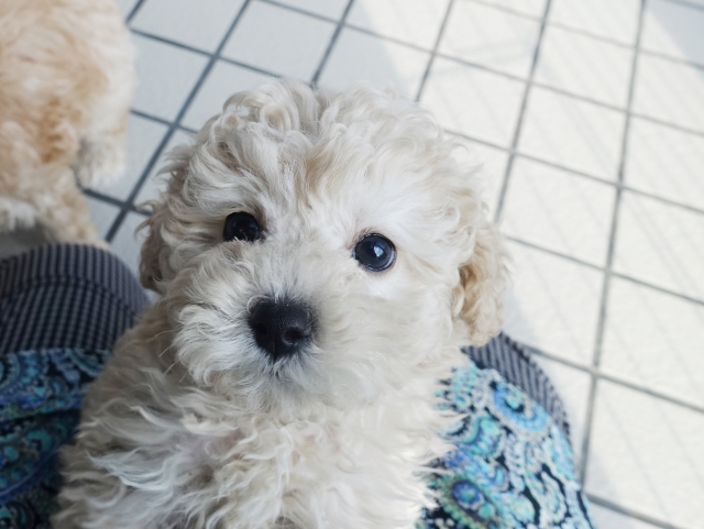 遠方からで少々心配もありましたが、石原ブリーダーの丁寧、親切なご対応で安心して子犬を迎えることができました。代理店の竹内ブリーダーにもきめ細やかなご対応をしていただき、感謝しております。目がクリクリとしていて可愛らしく、頭も良く、天真爛漫なマルプーの女の子が我が家の家族になってくれました。石原さんの愛情をたっぷり受けているので、物おじすることなく、誰にでも懐き、子供ともすぐに仲良くなりました。トイレもほぼ間違いなくシートにしてくれます。物覚えが良く、とても賢いので、躾けやすく助かります。健康優良児そのものです。アフターフォローも、すぐに対応してくださるので、安心して過ごせます。お陰様で毎日がハッピーです。ご縁に感謝しております。(東京都 男性)