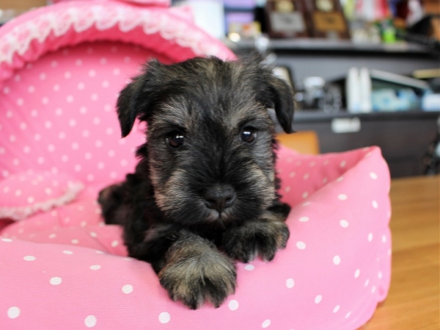 見学の申し込みからの対応も凄く良くて、当日の応対も非常に親切に的確に対応して貰えました。その場で直ぐにこの真摯な対応ができる人が繁殖させたワンコなら心配ないと思ったので内金を払い2週間後の昨日ワンコを引き取ることに致しました。ワンコを連れて新幹線に乗るのは初めてだったのでどんなもキャリーケースを用意して良いのか判らなかったので、準備をお願いしておいたところちゃんとした物を用意しておいてくれました。書類の説明や今後の飼い方その他に付いても質問にも丁寧に受け答えをしてくれて有難かったです。引渡し前にちゃんとシャンプーもされていたらしく良い匂いでした。この子でシュナウザーは4頭目ですが、今までにはこれほど手厚い対応をして貰ったのは初めてです。有り難うございました。(東京都 男性)
