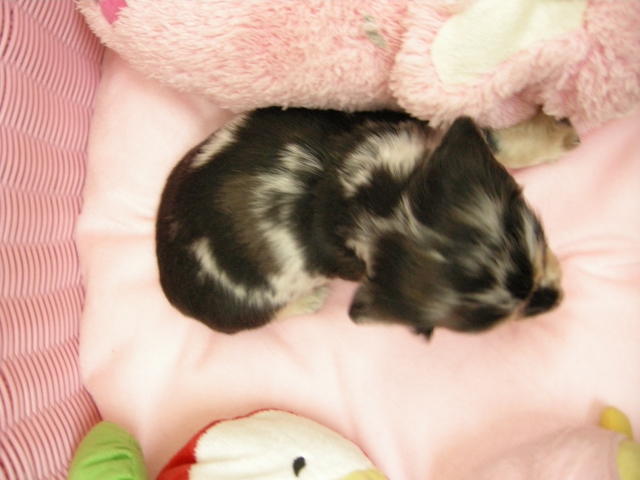この度は可愛いカニンヘンダックスの女の子を譲っていただきありがとうございます。濱田さんのところからのお迎えは2頭目で、可愛さは初めの子でわかりすぎるほどわかっていたので絶対可愛くなること間違いなしで決めさせていただきました。 どんなことでも相談してくださいねと言う心強い言葉や、可愛い動画を送っていただいたりと本当によくしていただけました。 ワンちゃんは初日からアイコンタクトばっちり、よく食べ、よく寝て、元気いっぱいです。 家にきて1週間、先住犬と遊びながら元気に成長中です。 またよろしくお願いします。(大阪府 女性)