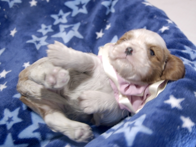 | コメント | お父さんはJKCチャンピオンの吉宗君、お母さんはチャンピオン直子リンダちゃんから生まれたキュートな女の子です。(桃リボンちゃん) 健康状態は、問題有りません。 すくすく育っています。 |