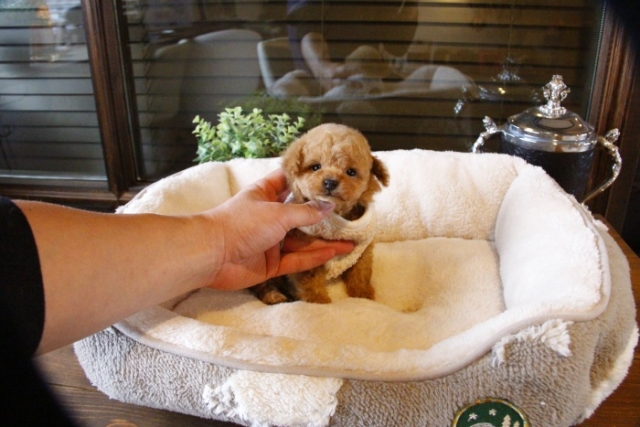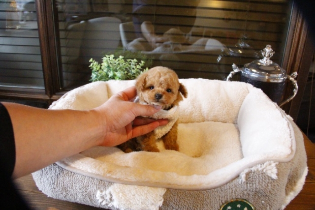 本日、我が家に小さな可愛い女の子のトイプードルがやって来ました。 遠距離という事もあり、暑い時期、飛行機の事なども心配していましだが、家に着いた途端、元気に走り、食欲も旺盛で、今まで大切に育てられてきたのだなぁ、ということがよくわかりました。 連休中にも関わらず、戸田様には、伊丹空港まで連れて来て頂き、こちらの質問にも的確に答えて下さいました。 大変信頼できるブリーダーです。 遠距離で悩まれている方も、安心して新しい家族を迎えられますよ。(兵庫県 男性)