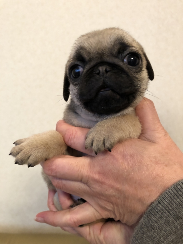 パグの飼育歴は30年以上になります。今年親の代から買っていた 黒パグを亡くしてから家を埋め尽くしているパググッズを見るたびに いつか新しい仔を迎えたいと思うようになりました。 北関東でブリーダーさんを探しているうちに木村様を知り、見学、購入の運びとなりました。 このたび性格も大変おおらかな素晴らしい仔犬をお譲りいただき大変感謝しております。 (茨城県 男性)