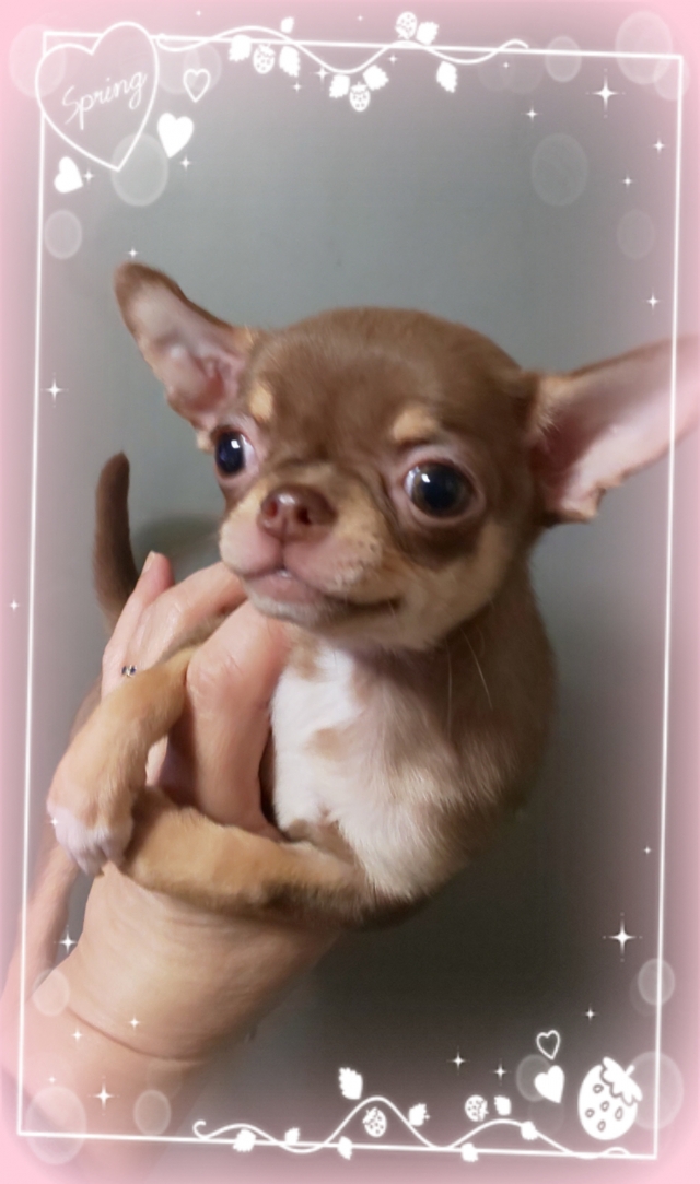 | コメント | レアなチョコタンのスムースちゃん。 最近、良く生まれています!! 3姉妹の中で、一番小振りな子です。 50日で、630gです。 可愛いサイズになりそうです。 空輸はしておりません。 カード、分割はしておりません。 ご家族様同意の上、お問い合わせ、ご見学ください。 他のブリーダー様、ペットショップさまからの続けてのご見学はお断りしています。 |