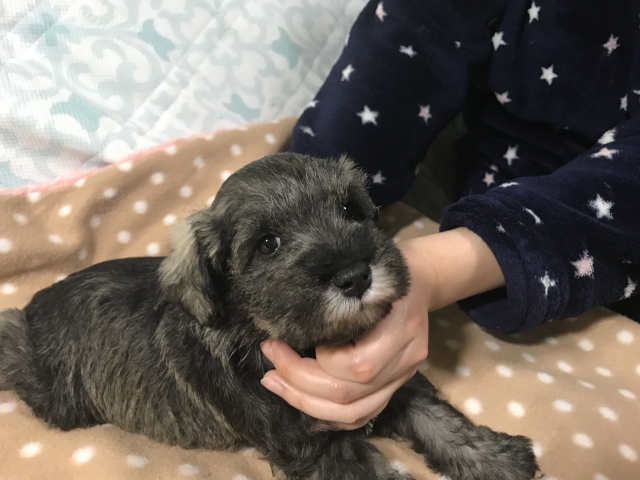 初めての仔犬(ミニチュアシュナウザー)を探している中で、気になった仔犬と出会い、この度我が家にわんこがやってきました。 まず第一に福井さんは信頼できるブリーダーです。犬のことを心から愛していますし、メールでの対応も信頼できる対応でした。仔犬を受け取るまでの対応を掲載させて頂きます。1、問い合わせメールの中で、仔犬がどのような親犬から生まれ、生まれた後に母犬にどのように育てられたかなどの心のこもった内容メールを頂けました。2、商談成立(生後35日程度)後も引き渡しまでの期間に仔犬の成長画像や動画を送って頂けました。3、引き渡し当日(空輸だったのですが)仔犬の事を一番に考えてくださり、電話で何度もやり取りしてくださりました。4、その他何でもご相談にのって下さります。我が家にやってきたシュナウザーはとても活発で(お利口さんです)福井さんには心から感謝しています。(茨城県 男性)