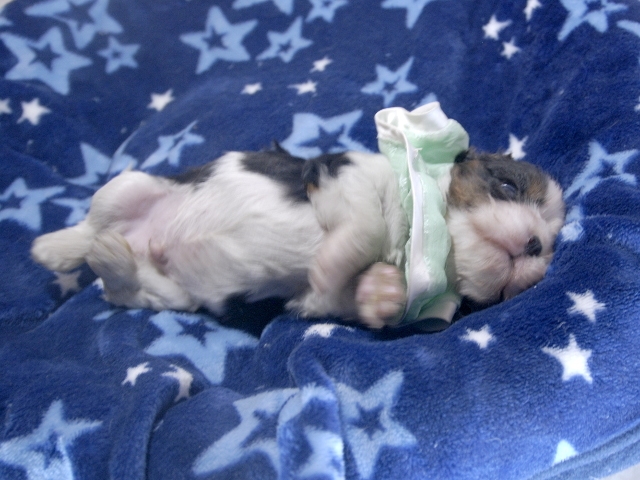 | コメント | お父さんはJKCチャンピオンの家重君、お母さんはチャンピオン直子レイラちゃんから生まれたダンディーな男の子です。(緑リボン君) 健康状態は、問題有りません。 すくすく育っています。 |