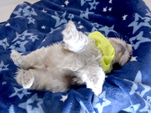 この度はとっても元気な子をありがとうございました。 見学の際は駅まで迎えにきていただき、説明もとても丁寧で安心しました。 空輸で送っていただき、ありがとうございました。 迎えてから一週間が経ち、家にも慣れて、へそ天で寝ています。 トイレトレーニングも、来た時から8割できていて、今ではほとんど失敗しなくなりました。 可愛く元気で、毎日元気に飛び跳ねています。(奈良県 女性)