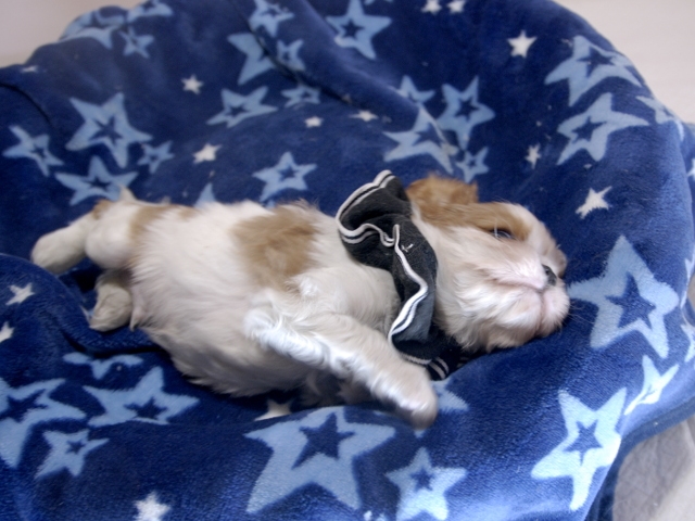 | コメント | お父さんはJKCチャンピオンの家重君、お母さんはチャンピオン直子インディーちゃんから生まれダンディーな男の子です。(黒リボン君) 健康状態は、問題有りません。 すくすく育っています。 |