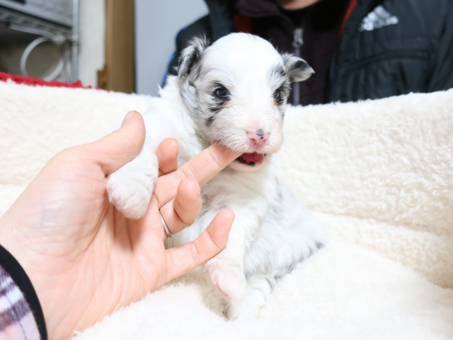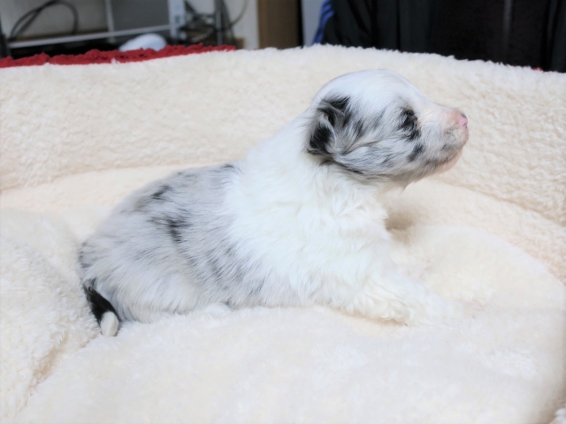 ネットブリーダーズを拝見し、バイブルーで青い目の子犬「銀くん」に一目ぼれしました。また、平山ブリーダー様の口コミがとても良かったこともあり、不安なく連絡をさせていただきました。お問い合わせ後すぐに丁寧な返信をいただき、見学の日程もスムーズに決まりました。 実際に伺うと、かわいいたくさんのシェルティちゃん達に迎えられ、たくさんの質問にも丁寧に答えてくださり、大変安心しました。お迎えした銀くんは、最初の1日はおとなしく心配になるほどでしたが、2日目からは甘えたり鳴いたりと元気を取り戻し、とても可愛い姿を見せてくれています。 平山ブリーダー様の元で大切に育てられてきたことがよく分かり、銀くんをお迎えできて心から良かったと思っています。 素敵なご縁をありがとうございました。(福島県 女性)