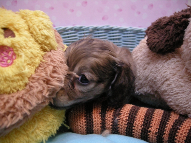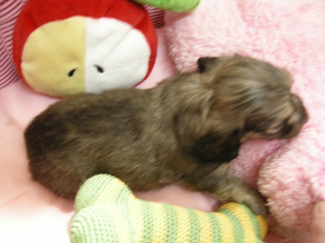 この度は可愛いカニンヘンダックスの女の子を譲っていただきありがとうございます。濱田さんのところからのお迎えは2頭目で、可愛さは初めの子でわかりすぎるほどわかっていたので絶対可愛くなること間違いなしで決めさせていただきました。 どんなことでも相談してくださいねと言う心強い言葉や、可愛い動画を送っていただいたりと本当によくしていただけました。 ワンちゃんは初日からアイコンタクトばっちり、よく食べ、よく寝て、元気いっぱいです。 家にきて1週間、先住犬と遊びながら元気に成長中です。 またよろしくお願いします。(大阪府 女性)