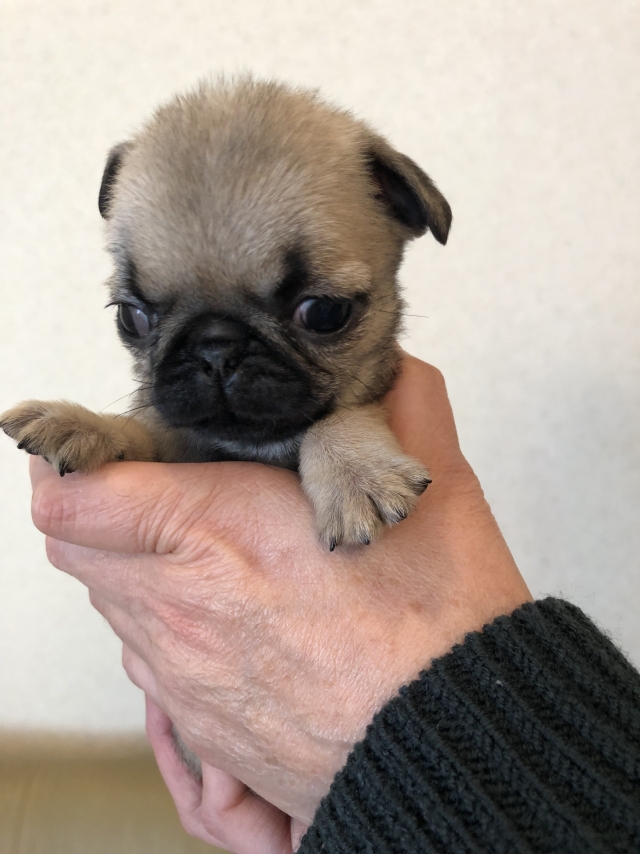 パグの飼育歴は30年以上になります。今年親の代から買っていた 黒パグを亡くしてから家を埋め尽くしているパググッズを見るたびに いつか新しい仔を迎えたいと思うようになりました。 北関東でブリーダーさんを探しているうちに木村様を知り、見学、購入の運びとなりました。 このたび性格も大変おおらかな素晴らしい仔犬をお譲りいただき大変感謝しております。 (茨城県 男性)