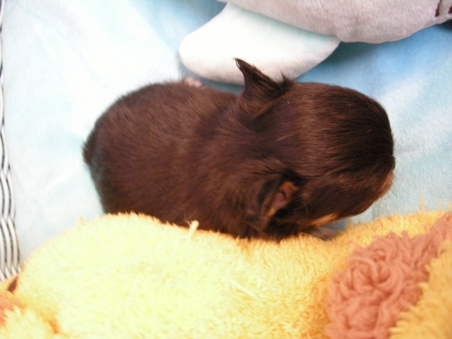 この度は可愛いカニンヘンダックスの女の子を譲っていただきありがとうございます。濱田さんのところからのお迎えは2頭目で、可愛さは初めの子でわかりすぎるほどわかっていたので絶対可愛くなること間違いなしで決めさせていただきました。 どんなことでも相談してくださいねと言う心強い言葉や、可愛い動画を送っていただいたりと本当によくしていただけました。 ワンちゃんは初日からアイコンタクトばっちり、よく食べ、よく寝て、元気いっぱいです。 家にきて1週間、先住犬と遊びながら元気に成長中です。 またよろしくお願いします。(大阪府 女性)