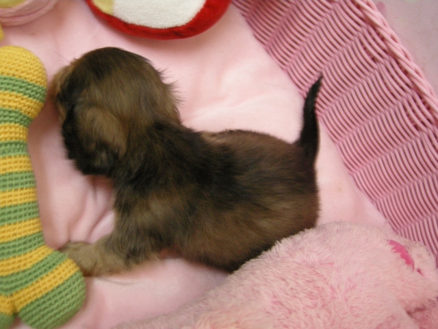 この度は可愛いカニンヘンダックスの女の子を譲っていただきありがとうございます。濱田さんのところからのお迎えは2頭目で、可愛さは初めの子でわかりすぎるほどわかっていたので絶対可愛くなること間違いなしで決めさせていただきました。 どんなことでも相談してくださいねと言う心強い言葉や、可愛い動画を送っていただいたりと本当によくしていただけました。 ワンちゃんは初日からアイコンタクトばっちり、よく食べ、よく寝て、元気いっぱいです。 家にきて1週間、先住犬と遊びながら元気に成長中です。 またよろしくお願いします。(大阪府 女性)