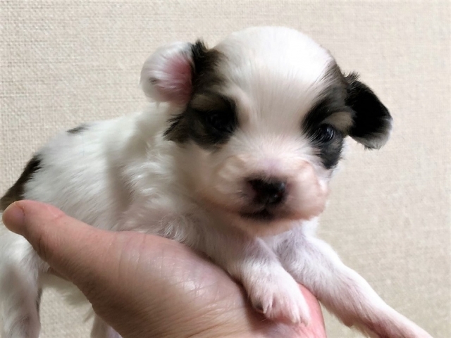 | コメント | 両親JKC.CHではありませんが、 両祖父母、良血統でJKC.CHになります。 可愛いお顔をしていますが、 片方のお耳の白毛が多くなってしまいました。 クールでおとなしい性格の子だと思います。 生後1ヶ月の体重は580gでした。 成犬時の予想サイズはやや小さめになると思います。 あくまでも、現時点での予想になります。 大きくなるかもしれませんし、 小さくなるかもしれません。 性格、体の大きさは生活環境で変わることがあります。 生体ですのでご理解いただきたく思います。 見学は大歓迎です。 本犬、親、お身内ワンコさんとも触れ合っていただきたいと思います。 ワクチン接種済みでご見学の場で決めていただけて、 そのままお持ち帰りの対応もさせていただきます。 その場合は譲渡金額のご用意もお願いします。 遠方の方で、後日お返事でお迎えを決めていただい場合のみ、 空輸又はご自宅までお届けさせていただきます。 その場合は交通費(高速代)、ガソリン代、諸経費等のご負担をお願いいたします。 その他詳しくはお問い合わせメールの返信メールに当犬舎の譲渡規約を添付させていただきます。 よくお読みになっていただきたく思います。 |