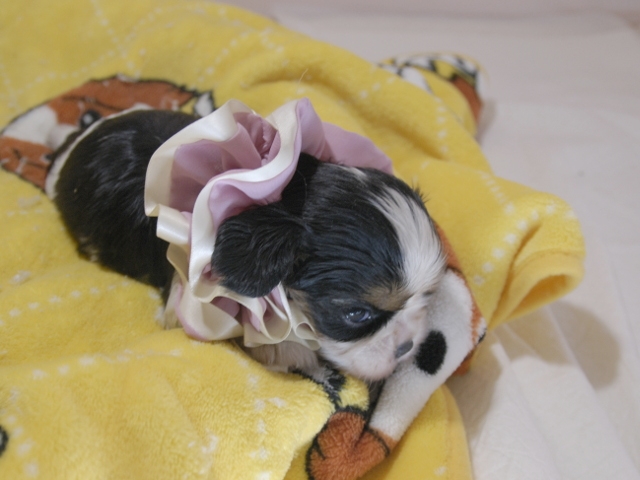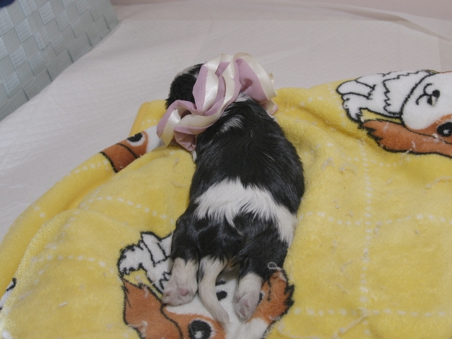 | コメント | お父さんはJKCチャンピオンの家重君、お母さんはチャンピオン直子カーラちゃんから生まれキュートな女の子です。(桃リボンちゃん) 健康状態は、問題有りません。 すくすく育っています。 |