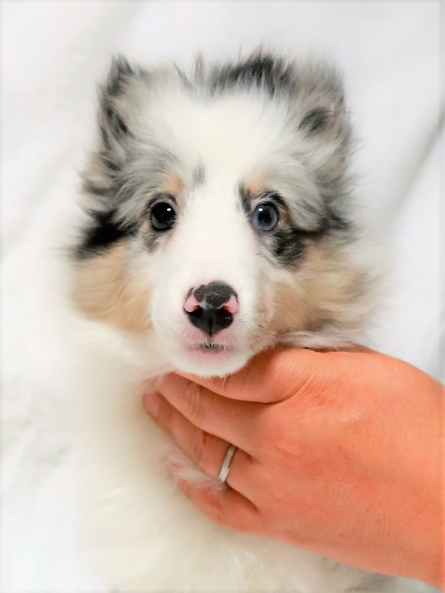 ネットブリーダーズを拝見し、バイブルーで青い目の子犬「銀くん」に一目ぼれしました。また、平山ブリーダー様の口コミがとても良かったこともあり、不安なく連絡をさせていただきました。お問い合わせ後すぐに丁寧な返信をいただき、見学の日程もスムーズに決まりました。 実際に伺うと、かわいいたくさんのシェルティちゃん達に迎えられ、たくさんの質問にも丁寧に答えてくださり、大変安心しました。お迎えした銀くんは、最初の1日はおとなしく心配になるほどでしたが、2日目からは甘えたり鳴いたりと元気を取り戻し、とても可愛い姿を見せてくれています。 平山ブリーダー様の元で大切に育てられてきたことがよく分かり、銀くんをお迎えできて心から良かったと思っています。 素敵なご縁をありがとうございました。(福島県 女性)