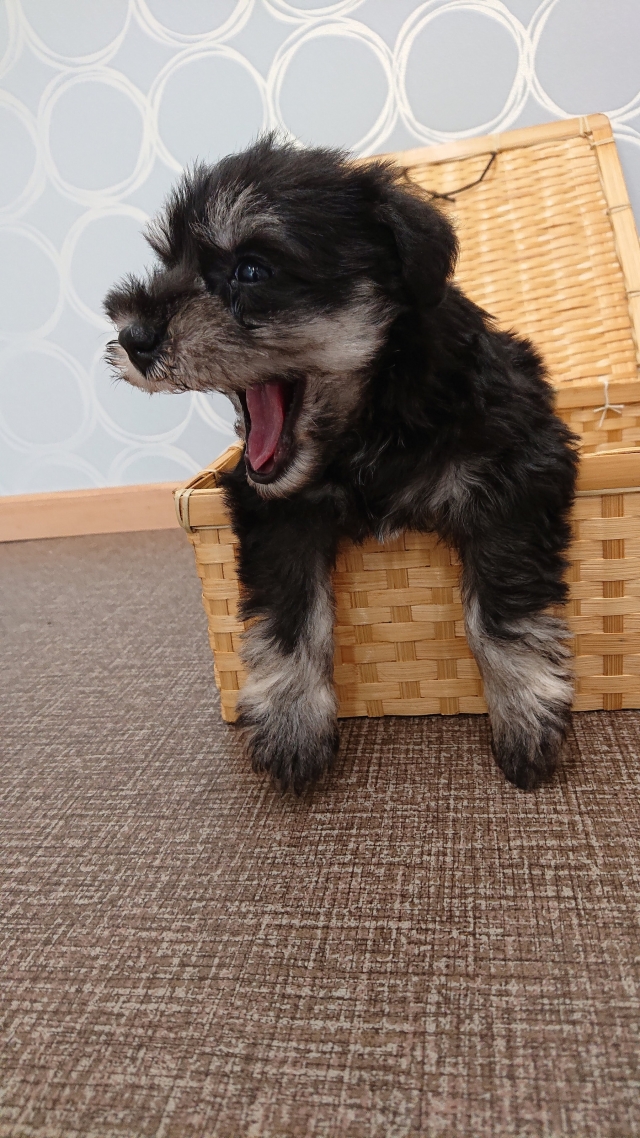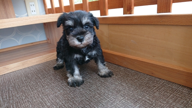 以前からミニチュアシュナウザーを飼っていたのですが8月初めに」16歳で亡くなりもう飼わないつもりでしたが居なくなると寂しく ネットで探すだけと思い見ていたらここのワンちゃんと 出会いブリーダーさんに色々質問してしまい快くお返事を頂きブラック&シルバーの子が前から可愛いと思っていたのですが 迷いました ブリーダーさんにお会いしないといけないのは参りました 私は東京ブリーダーさん福岡 福岡まで迎えに行く電車賃&宿代を出してもたまたま東京で買う金額と変わらなかったので良かったです ブリーダーさんには本当に良くしてもらいました しつこく質問しても必ず返信してくれました この子を大事に育てていきます 色々有り難う御座いました これからも頑張ってください (東京都 男性)