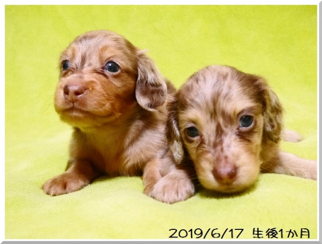 | コメント | パパはJKCチャンピオンの茶美太【ちゃみた】君(シルバーダップル) ママはJKCチャンピオン直娘の空星【クララ】ちゃん(チョコレート&イエロー) 両親共にとても良い子で、前回同じ組み合わせ手生まれた子達もとっても美男子くんに成長しました。 毛色はチョコレートダップルです。 全身にダップルの柄の入ったきれいな子犬ちゃんです。 PRA(遺伝性網膜委縮症)が発症する心配もありません。 お迎えいただけるのは2回目のワクチン接種と健康診断を実施後で、だいたい7月10日以降となります。 遠方の方はお届けも可能です。(別途お届にかかる費用が発生いたします。) お問い合わせをお待ちしております。 今回早期からの募集を開始いたしました。生後40日までにご予約をいただいた方へは3種混合ワクチン、6種混合ワクチン、健康診断を当方負担にてお渡しさせていただきます。 |
