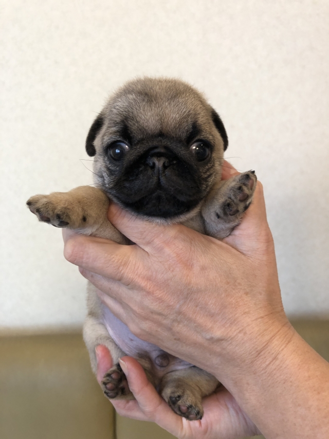 パグの飼育歴は30年以上になります。今年親の代から買っていた 黒パグを亡くしてから家を埋め尽くしているパググッズを見るたびに いつか新しい仔を迎えたいと思うようになりました。 北関東でブリーダーさんを探しているうちに木村様を知り、見学、購入の運びとなりました。 このたび性格も大変おおらかな素晴らしい仔犬をお譲りいただき大変感謝しております。 (茨城県 男性)