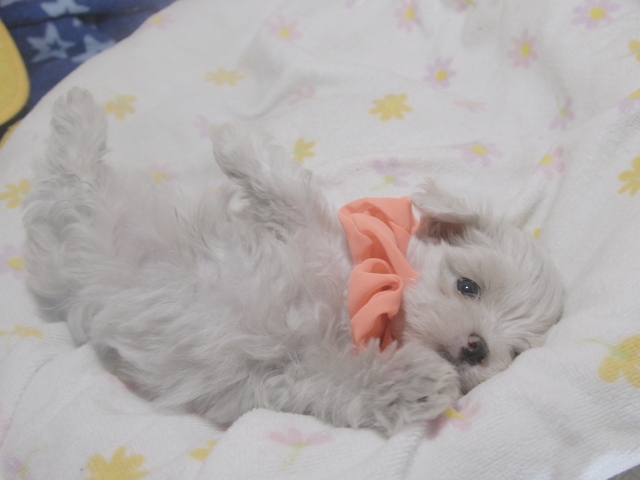 この度はとっても元気な子をありがとうございました。 見学の際は駅まで迎えにきていただき、説明もとても丁寧で安心しました。 空輸で送っていただき、ありがとうございました。 迎えてから一週間が経ち、家にも慣れて、へそ天で寝ています。 トイレトレーニングも、来た時から8割できていて、今ではほとんど失敗しなくなりました。 可愛く元気で、毎日元気に飛び跳ねています。(奈良県 女性)