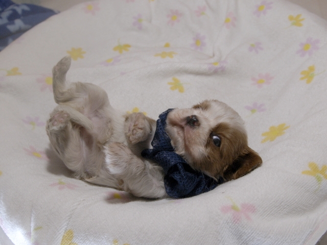 この度はとっても元気な子をありがとうございました。 見学の際は駅まで迎えにきていただき、説明もとても丁寧で安心しました。 空輸で送っていただき、ありがとうございました。 迎えてから一週間が経ち、家にも慣れて、へそ天で寝ています。 トイレトレーニングも、来た時から8割できていて、今ではほとんど失敗しなくなりました。 可愛く元気で、毎日元気に飛び跳ねています。(奈良県 女性)