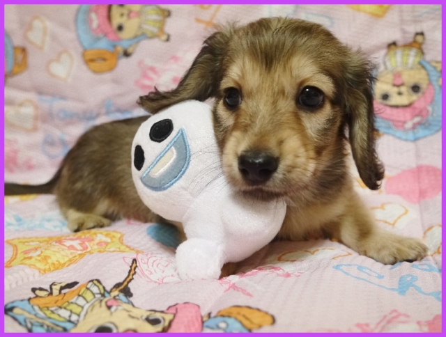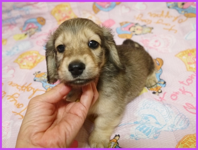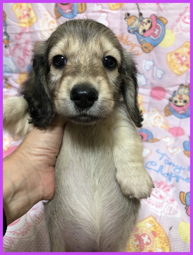 | コメント | パパは両親共にJKCチャンピオン同士から生まれたカニンヘンロングダックスのシェーデットイエローですので、子犬ちゃんはミニチュアロングダックス登録となりますが、サイズは小ぶりです。 当初レッドかなと思っていましたが成長と共にどんどん明るい毛色になって将来的には黒い刺し毛が無くなりますので、きれいなクリーム色の毛色になります。 とても可愛らしく愛らしいお目目が特徴的です。 健康状態も良好で欠点などはありません。 今回はレッドと同じ金額で募集させていただきますので、ぜひご検討ください。 ぜひ素敵なご縁がありますように、、、、 お問い合わせをお待ちしております。 |