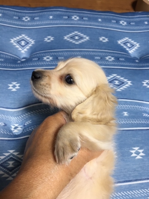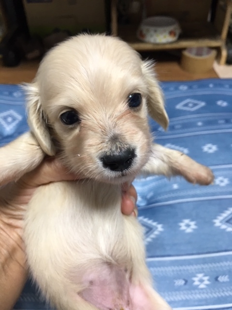 | コメント | 父 カニンヘン イエロー 2.6kg 母 ミニチュア クリーム 2.6kg (カニンヘンサイズです。) とってもきれいなクリームの仔です。 ちっちゃな仔で、かわいいこですよ。 ちっちゃくても、しっかりご飯を食べてずっしりと重い仔ですよ。 PRAは、発症しません。 今は、まだ 寝てばかりです。 おっとりタイプです。 当犬舎では、見学順ではなく、予約入金確認後(三分の一)を 優先とさせて頂いていますので、ご了承ください。 お問い合わせは お気軽にお問い合わせください。 お待ちしております。 |