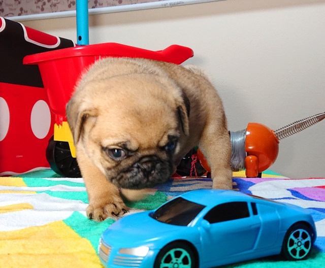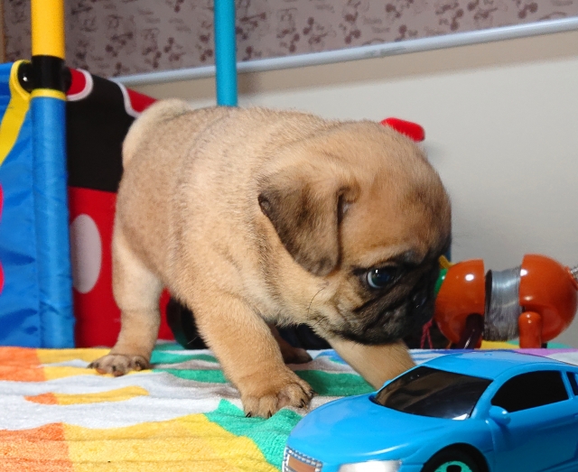 このサイトからパグを見つけ、写真を見た瞬間「この子だ」と思い すぐブリーダーさんに連絡し、訪問面会となりました。 この子が気に入ったのはもちろんですが、とても清潔きれいにされていた環境で生まれ、ブリーダーである小林様の人柄ももちろん、色々親切丁寧に教えていただき非常に安心出来ると思い購入を決めました。購入後も定期的にメールいただき近況をお知らせしております。 そして、何かあれば気軽にお問い合わせくださいとも言っていただき 何かあれば相談にのっていただこうと思っております。 どのような環境で生まれ、両親も確認できるのはブリーダーさんから直購入のいいところだと思います。 ペットショップで購入しなくて良かったと思います。 小林様 本当にありがとうございました。 (東京都 男性)