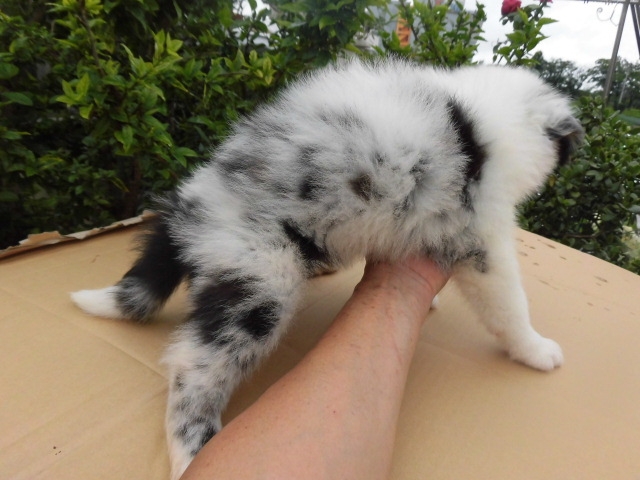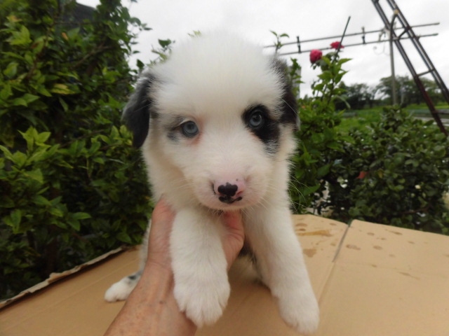 | コメント | 父親/ブルーマール JKCチャンピオン孫 母親/ブラック&ホワイト 訓練競技会系統 家庭犬・競技会犬に如何でしょうか。 |