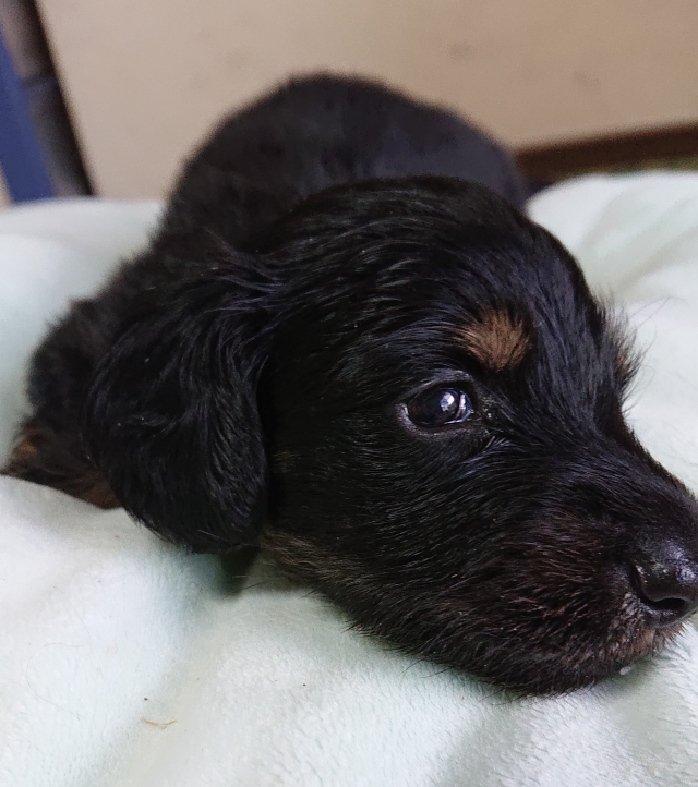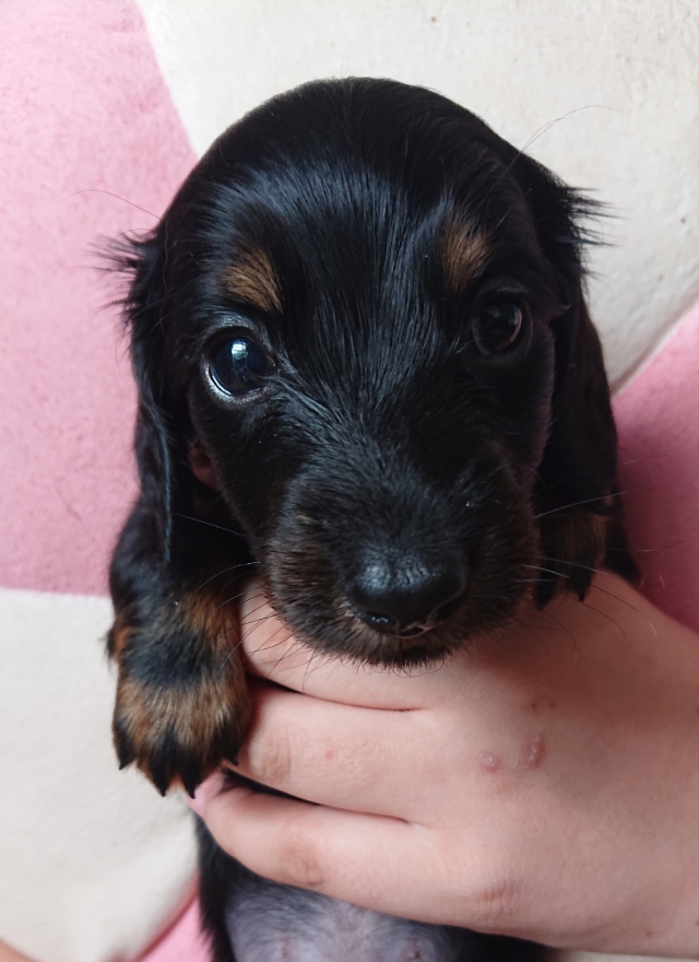 | コメント | 母親レッドのミニチュアダックス 父親イエローのミニチュアダックス 父親はカニーヘンサイズに近いサイズです この間より生まれたブラックタンのきれいなブラック色 綺麗です 犬舎では、お渡しするまでに、トイレのマナーをしつけてお渡ししております (時には環境の変化で、失敗する事もあります) |
