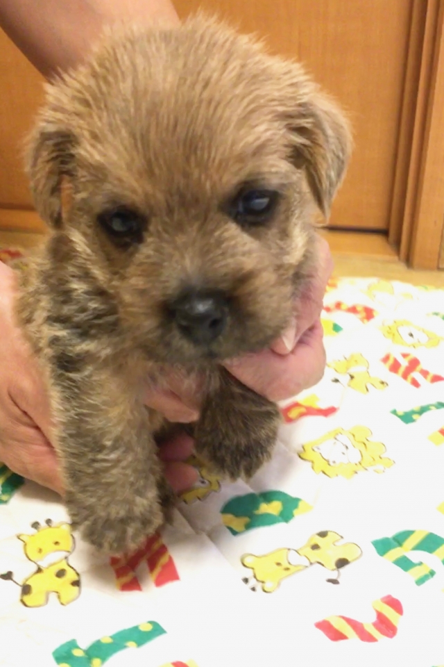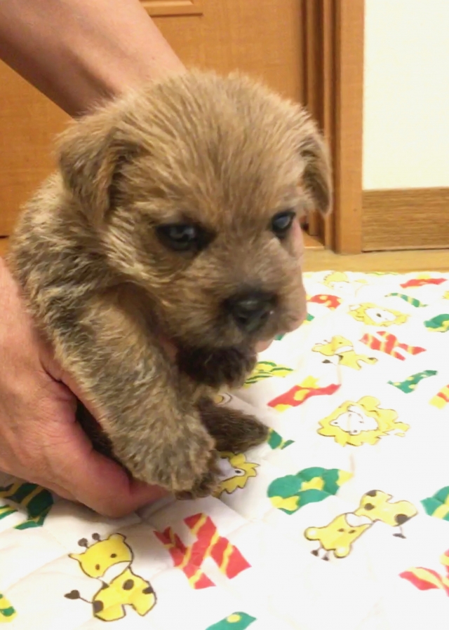 生後70日位で引き取りに参りました。 もっと早く受け取りたかったのですが、たまたま関西行く用事があり 直接引き取り参りました。 藤家さんに直接お会い出来、色々と飼育の方法等ご教授頂き助かりました。子犬はとても元気で東京に帰る時も一度もぐずらず長時間にま限らずおとなしくゲージの中におりました。 現在は、食事も3回食欲もあり元気に過ごしております。 乳歯が生えてきており歯が痒いのでしょう。私たちの指を歯固め代わりにじゃれております。 藤家さんの躾がいいのでちゃんとおしっこマットにするし今のところは満点です。 (東京都 男性)
