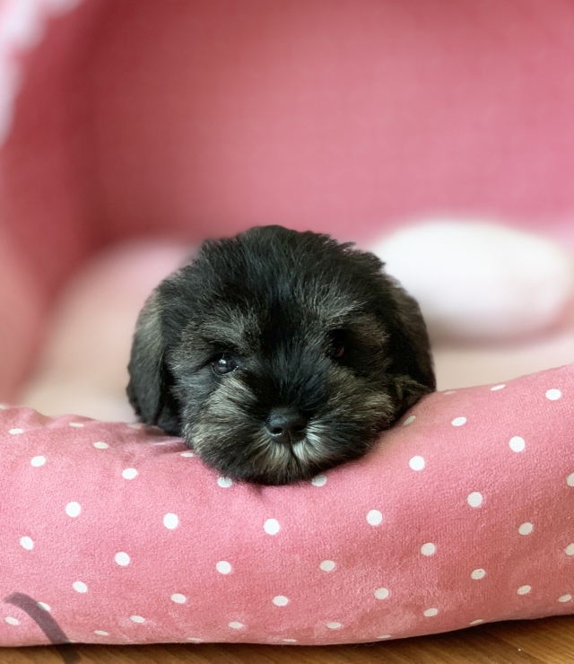 シュナウザーを主力にされているブリーダーさんだと認識しており、ボスちゃんはどうかなあと正直不安でしたがとても可愛く健康的なボスちゃんをいただきました。 掲載されていた写真より実物は想像以上に可愛くて即決し見学させていただいたその日に連れて帰りました。連絡をして、翌日行きますぅって勝手な申し出にも関わらず敏速かつ親切に対応して頂き大満足です。契約に対しても一つ一つ丁寧に説明してくださり、わかりやすかったです。この度は可愛いボスちゃんとのご縁をいただき、本当に有り難うございました。 (大阪府 女性)
