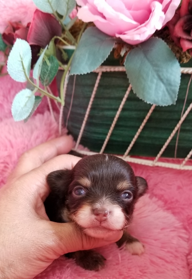 | コメント | 父親 チョコタン(ブラック因子)2.0kg 母親 チョコタン2.0kg 小さなお母さんから可愛い男の子がうまれました。 お顔もつまってアップルヘッド まだ、目も開いてきて、もう少し経てばお目目もパッチリ✨可愛くなりますよ 是非ご家族の一員にお迎えくださいませ。 宜しくお願い致しますm(。_。)m |