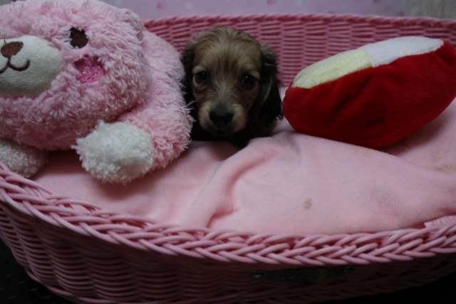 この度は可愛いカニンヘンダックスの女の子を譲っていただきありがとうございます。濱田さんのところからのお迎えは2頭目で、可愛さは初めの子でわかりすぎるほどわかっていたので絶対可愛くなること間違いなしで決めさせていただきました。 どんなことでも相談してくださいねと言う心強い言葉や、可愛い動画を送っていただいたりと本当によくしていただけました。 ワンちゃんは初日からアイコンタクトばっちり、よく食べ、よく寝て、元気いっぱいです。 家にきて1週間、先住犬と遊びながら元気に成長中です。 またよろしくお願いします。(大阪府 女性)