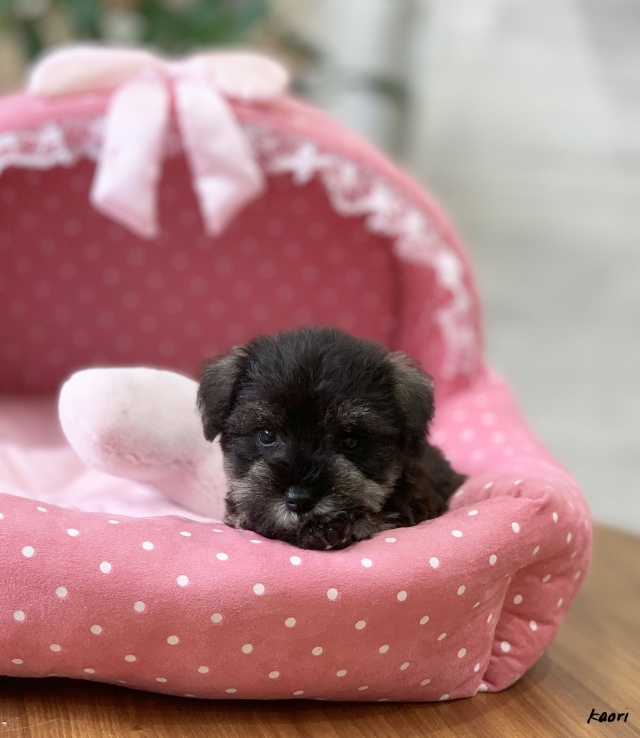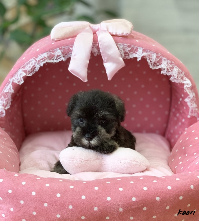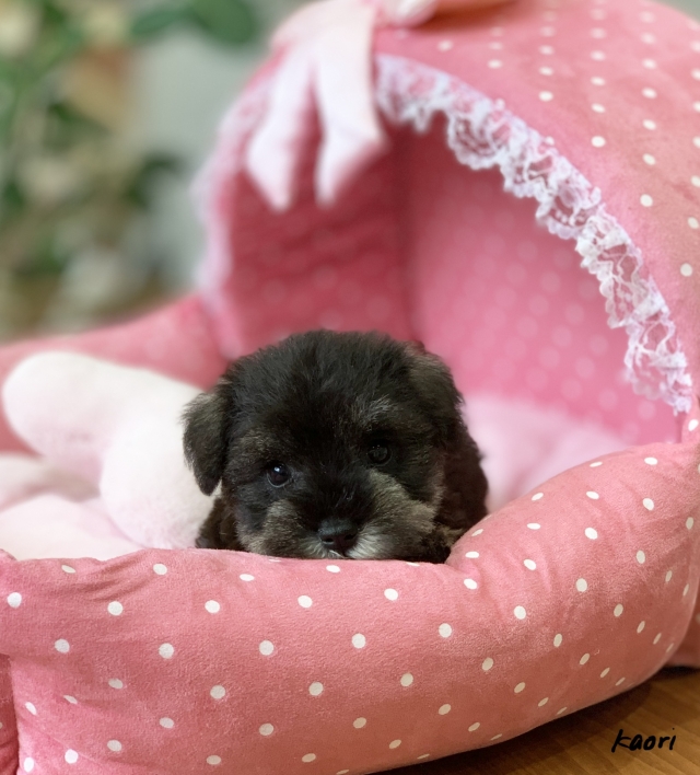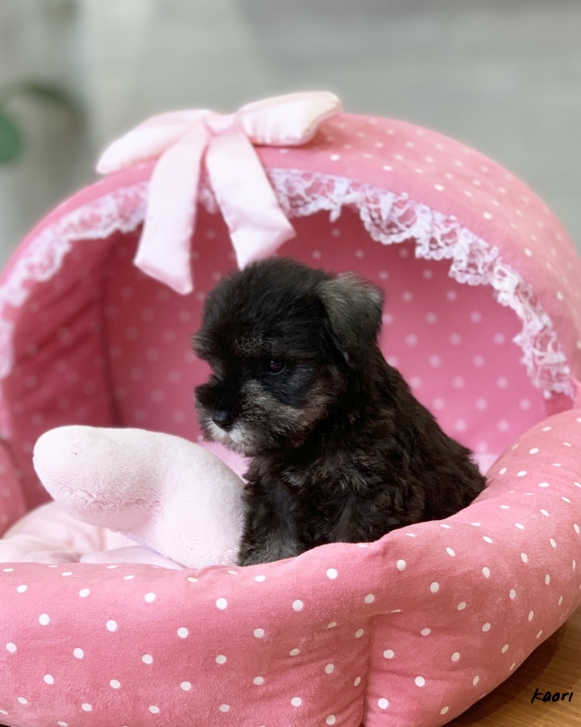 シュナウザーを主力にされているブリーダーさんだと認識しており、ボスちゃんはどうかなあと正直不安でしたがとても可愛く健康的なボスちゃんをいただきました。 掲載されていた写真より実物は想像以上に可愛くて即決し見学させていただいたその日に連れて帰りました。連絡をして、翌日行きますぅって勝手な申し出にも関わらず敏速かつ親切に対応して頂き大満足です。契約に対しても一つ一つ丁寧に説明してくださり、わかりやすかったです。この度は可愛いボスちゃんとのご縁をいただき、本当に有り難うございました。 (大阪府 女性)