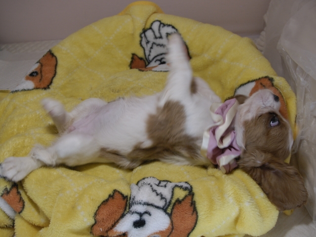この度はとっても元気な子をありがとうございました。 見学の際は駅まで迎えにきていただき、説明もとても丁寧で安心しました。 空輸で送っていただき、ありがとうございました。 迎えてから一週間が経ち、家にも慣れて、へそ天で寝ています。 トイレトレーニングも、来た時から8割できていて、今ではほとんど失敗しなくなりました。 可愛く元気で、毎日元気に飛び跳ねています。(奈良県 女性)