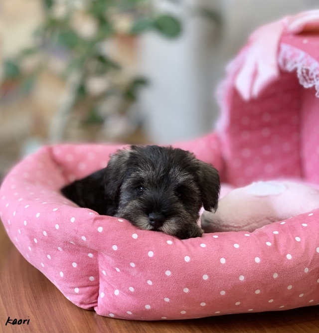 シュナウザーを主力にされているブリーダーさんだと認識しており、ボスちゃんはどうかなあと正直不安でしたがとても可愛く健康的なボスちゃんをいただきました。 掲載されていた写真より実物は想像以上に可愛くて即決し見学させていただいたその日に連れて帰りました。連絡をして、翌日行きますぅって勝手な申し出にも関わらず敏速かつ親切に対応して頂き大満足です。契約に対しても一つ一つ丁寧に説明してくださり、わかりやすかったです。この度は可愛いボスちゃんとのご縁をいただき、本当に有り難うございました。 (大阪府 女性)
