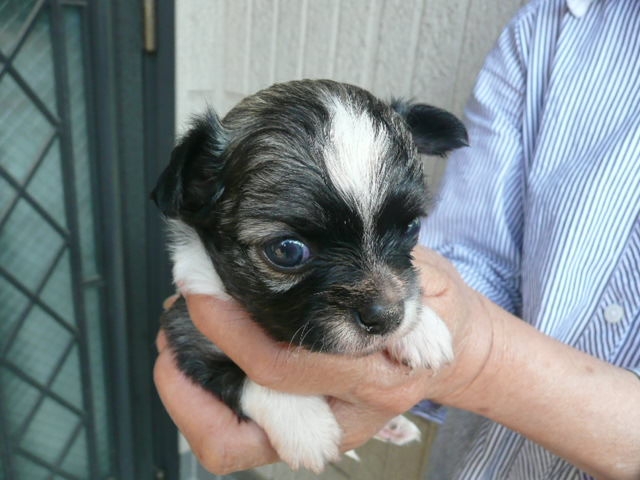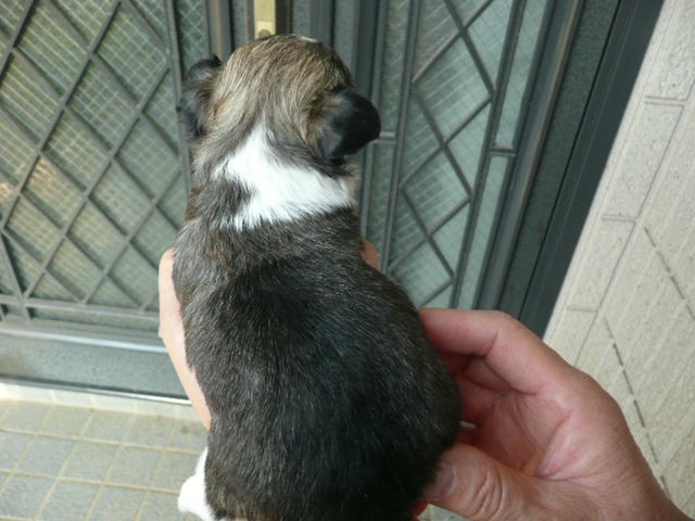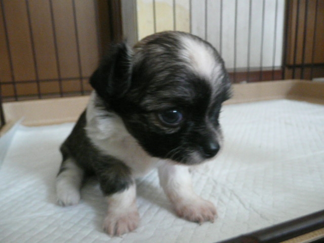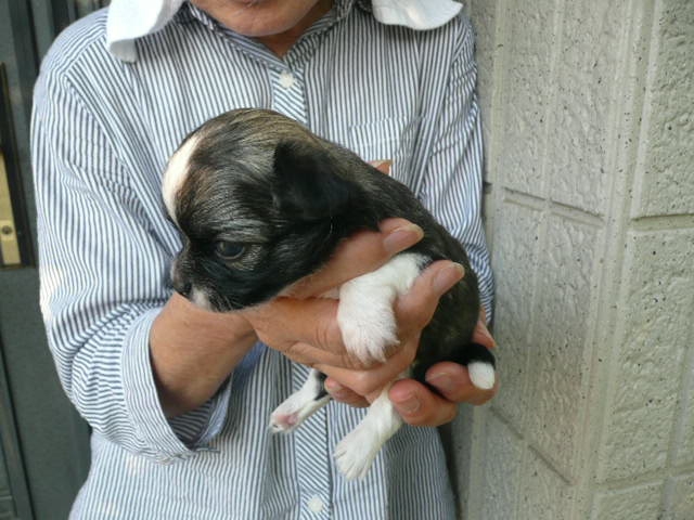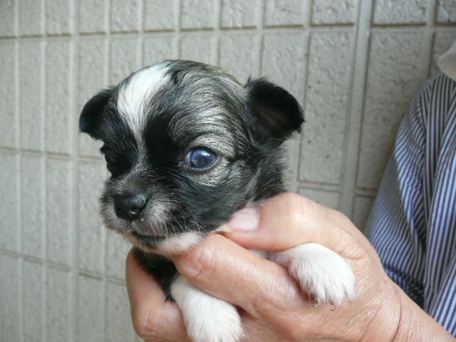 | コメント | 父方の祖父、祖母とも有名犬舎の犬でJKCチャンピオン、曽祖父はアメリカチャンピオンです。 お母さん犬は当犬舎の犬で2.1kgです。 母方の血統も有名犬舎の血統です。 7/10に2頭の兄妹で生まれました。 8/1( 生後22日)の体重は390gです。 毛色はフォーン&ホワイトです。 写真ではまだ黒く見えますが段々とフォーンに変化します。.(レッド&ホワイトになるかも知れません。) 頭部にホワイトのブレーズがあります。 胸から前足にかけてのホワイトの毛がきれいです。 アップルヘッドの頭部、しっかりとしたボディが自慢です。 現在は小型犬特有の非常に小さなペコ(大泉門)がありますが成長とともに塞がると思います。 8/9で生後30日となり子犬2頭で元気にじゃれあっています。 是非、見学にお出でください。 お待ちしております。 |