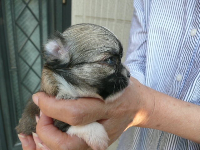 | コメント | 父方の祖父、祖母とも有名犬舎の犬でJKCチャンピオン、曽祖父はアメリカチャンピオンです。 お母さん犬は当犬舎の犬で2.1kgです。 母方の血統も有名犬舎の血統です。 7/10に2頭の兄妹で生まれました。 8/1( 生後22日)の体重は320gです。 毛色はフォーン&ホワイトです。 写真ではまだ黒く見えますが段々とフォーンに変化します。 頭部にホワイトのブレーズがあります。 胸から前足にかけてのホワイトの毛がきれいです。 アップルヘッドの頭部、しっかりとしたボディが自慢です。 現在は小型犬特有の非常に小さなペコ(大泉門)がありますが成長とともに塞がることを期待しています。 8/9で生後30日となり子犬2頭で元気にじゃれあっています。 是非、見学にお出でください。 お待ちしております。 |