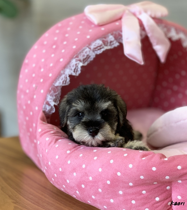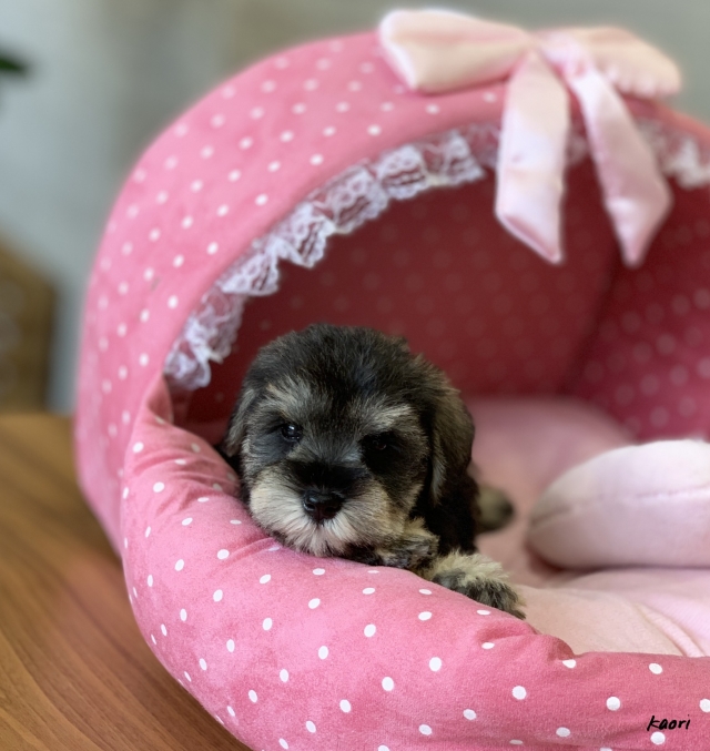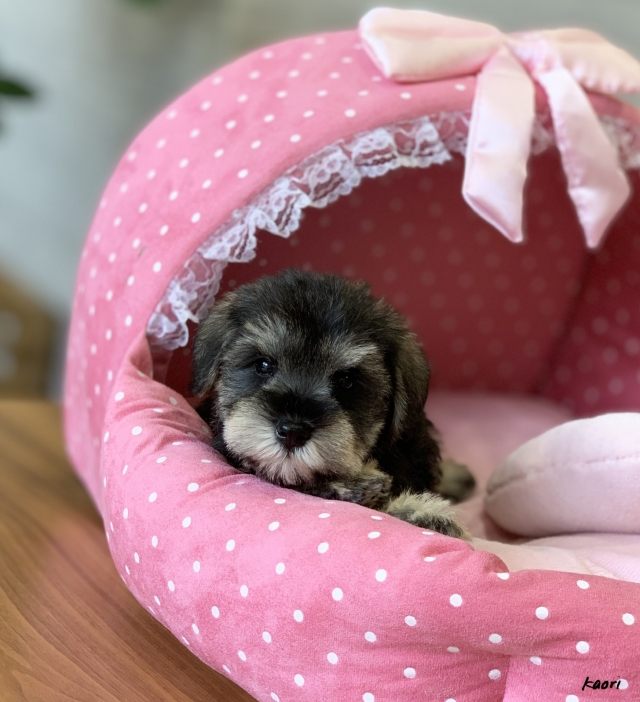 シュナウザーを主力にされているブリーダーさんだと認識しており、ボスちゃんはどうかなあと正直不安でしたがとても可愛く健康的なボスちゃんをいただきました。 掲載されていた写真より実物は想像以上に可愛くて即決し見学させていただいたその日に連れて帰りました。連絡をして、翌日行きますぅって勝手な申し出にも関わらず敏速かつ親切に対応して頂き大満足です。契約に対しても一つ一つ丁寧に説明してくださり、わかりやすかったです。この度は可愛いボスちゃんとのご縁をいただき、本当に有り難うございました。 (大阪府 女性)