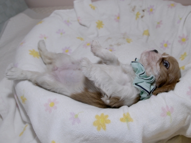 この度はとっても元気な子をありがとうございました。 見学の際は駅まで迎えにきていただき、説明もとても丁寧で安心しました。 空輸で送っていただき、ありがとうございました。 迎えてから一週間が経ち、家にも慣れて、へそ天で寝ています。 トイレトレーニングも、来た時から8割できていて、今ではほとんど失敗しなくなりました。 可愛く元気で、毎日元気に飛び跳ねています。(奈良県 女性)