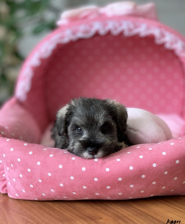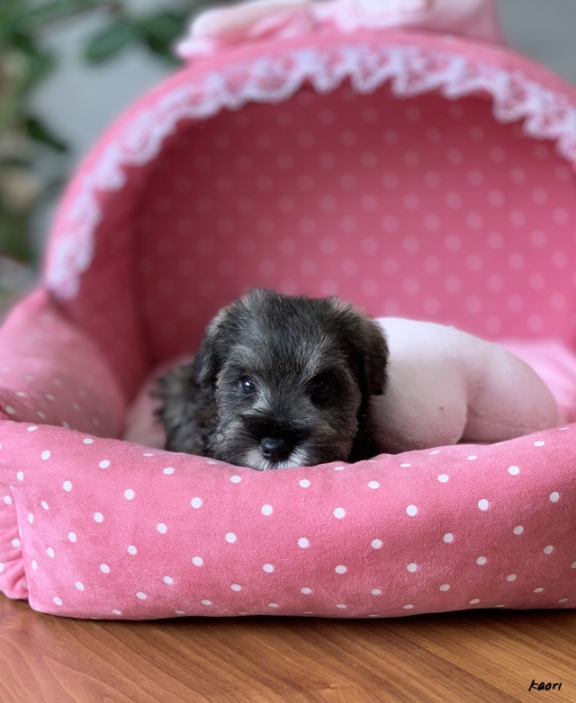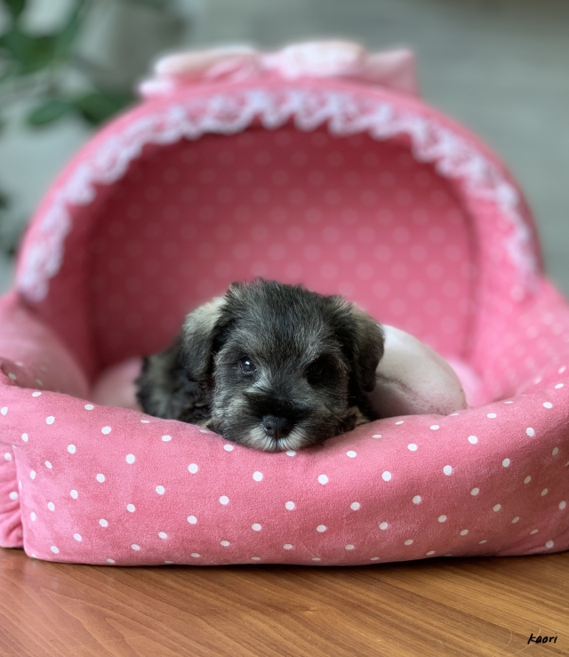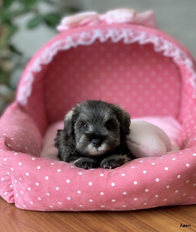 シュナウザーを主力にされているブリーダーさんだと認識しており、ボスちゃんはどうかなあと正直不安でしたがとても可愛く健康的なボスちゃんをいただきました。 掲載されていた写真より実物は想像以上に可愛くて即決し見学させていただいたその日に連れて帰りました。連絡をして、翌日行きますぅって勝手な申し出にも関わらず敏速かつ親切に対応して頂き大満足です。契約に対しても一つ一つ丁寧に説明してくださり、わかりやすかったです。この度は可愛いボスちゃんとのご縁をいただき、本当に有り難うございました。 (大阪府 女性)