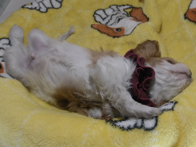 この度はとっても元気な子をありがとうございました。 見学の際は駅まで迎えにきていただき、説明もとても丁寧で安心しました。 空輸で送っていただき、ありがとうございました。 迎えてから一週間が経ち、家にも慣れて、へそ天で寝ています。 トイレトレーニングも、来た時から8割できていて、今ではほとんど失敗しなくなりました。 可愛く元気で、毎日元気に飛び跳ねています。(奈良県 女性)